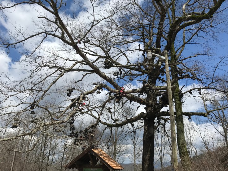 Nous avons franchis une 1ère étape, un 1ère seuil psychologique atteint: notre 1er ravitaillement à Neels Gap. C’est l’endroit où les 1er randonneurs quittent le sentier. La tradition veut que les randonneurs quittant à cet endroit lance leurs souliers dans un arbre: « The Boot Tree »