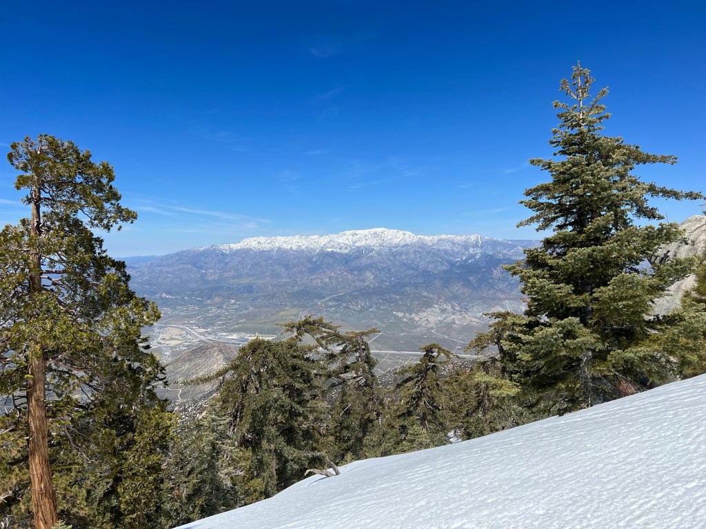 Nous sommes dans une forêt de pins et c’est couvert de neige. C’est très beau, mais ce n’est pas notre premier choix de marcher dans la neige. Nous suivons les traces de pas des autres randonneurs, mais il faut à l’occasion, regarder notre carte. C’est facile de si perdre. Nous avons passé 8000 pieds d’altitude, ce qui est plus haut que ce que nous avons monté sur l’AT. Nous avons l’occasion, dans le courant de la journée, de parler à des suisses, et des canadiens. Nous voyons peu d’américains. À notre site de tente, nous avons une vue incroyable sur le mont San Jacinto et San Gorgonio.