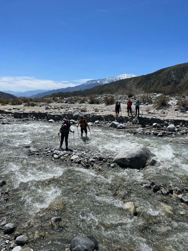 Notre troisième journée s’annonce très belle, tôt le matin il fait déjà chaud. Nous avons une bonne monté à faire, mais qui sera payante. Rendus en haut, un groupe de femmes arrivent en même temps que nous. Nous discutons avec elles et nous avons droit à des “Trail Magic”, une orange et des M&M aux arachides. Probablement la meilleure orange que j’ai mangé de ma vie…ou presque, il faut bien dramatiser un peu. La matinée est parfaite, nous constatons que tout est en fleurs, nous voyons de plus en plus de bêtes de toutes sorte, dont des lézards et des serpents. On dirait que c’est terminé avec le mauvais temps, nous gardons les doigts croisés. Nous avons comme objectif de dîner de l’autre côté de la rivière Whiteface, que nous devons traverser les pieds dans l’eau. Elle fait 20 pieds de large et il y a beaucoup de courant. Après une longue analyse hydrologique de Caroline, nous avons l’endroit qui semble le plus sécuritaire. Je me lance le premier, tout va bien. Je dépose mon sac et retourne aider Caroline. Sain et sauf tous les deux. Nous cassons la croûte au soleil pour se sécher. Encore quelques miles en après-midi pour rejoindre Mission Creek.
